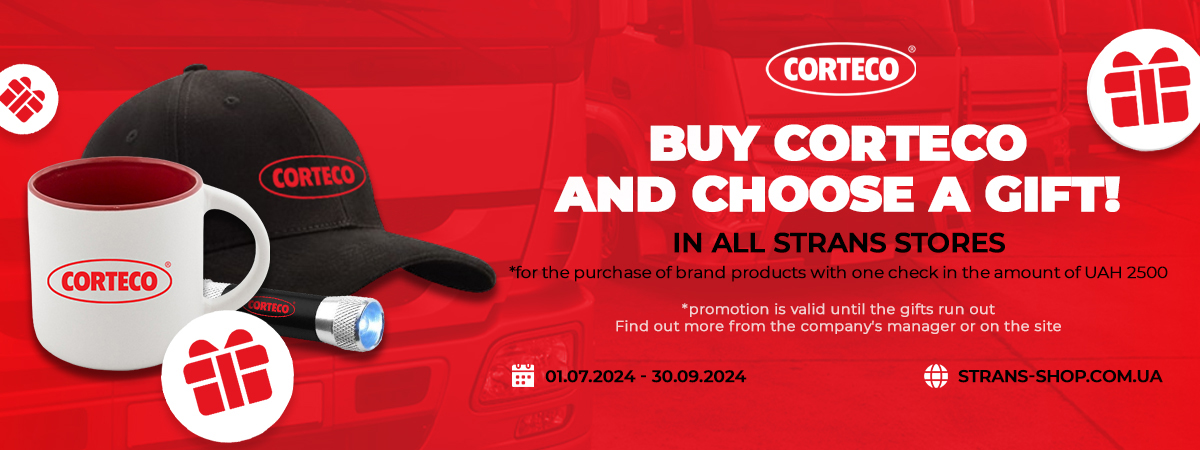Corteco has prepared useful gifts for all customers of Strans stores! To participate in the promotion, you just need to purchase the brand's products in the amount of UAH 2,500 in one check. Among the prizes: a branded cap, a mug and a flashlight keychain. You can choose a gift yourself! The promotion will last from July 1 to September 30 or until the gifts run out.