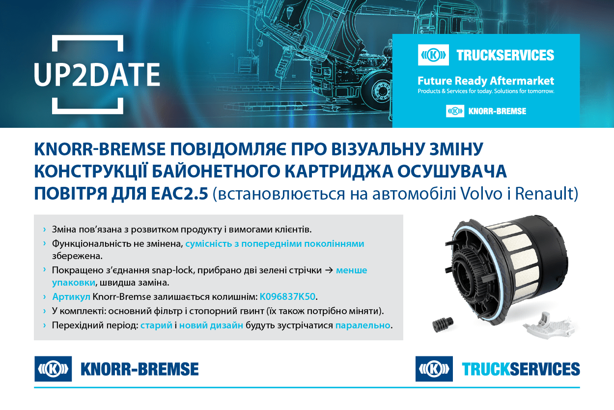 Knorr-Bremse повідомляє про візуальну зміну конструкції байонетного картриджа осушувача повітря для EAC2.5 (встановлюється на автомобілі Volvo і Renault).
