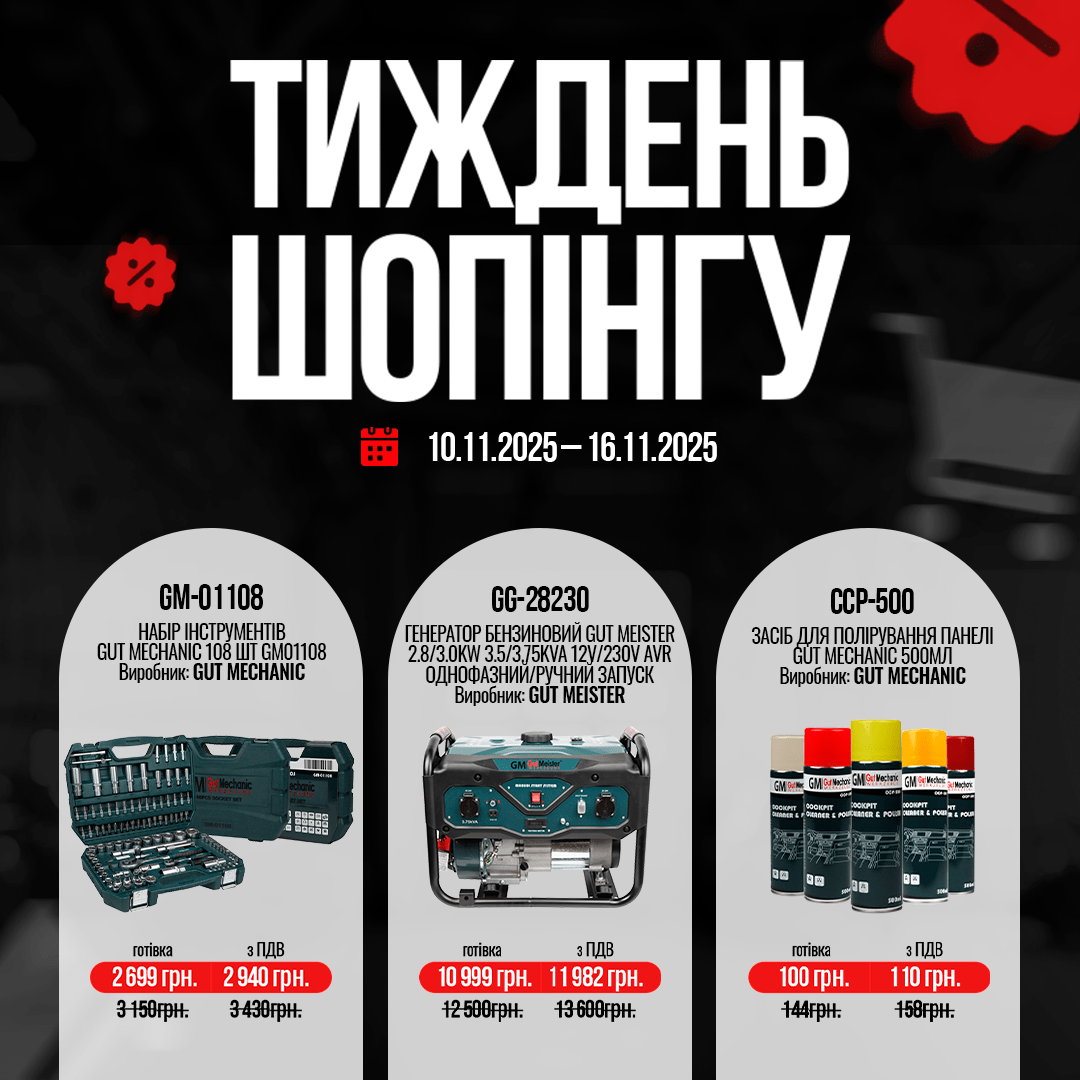 - 12 000 грн у подарунок Набір викруток і біт Gut Meister 37 шт або Набір ключів рожково-накидних з трещіткою, 8 шт