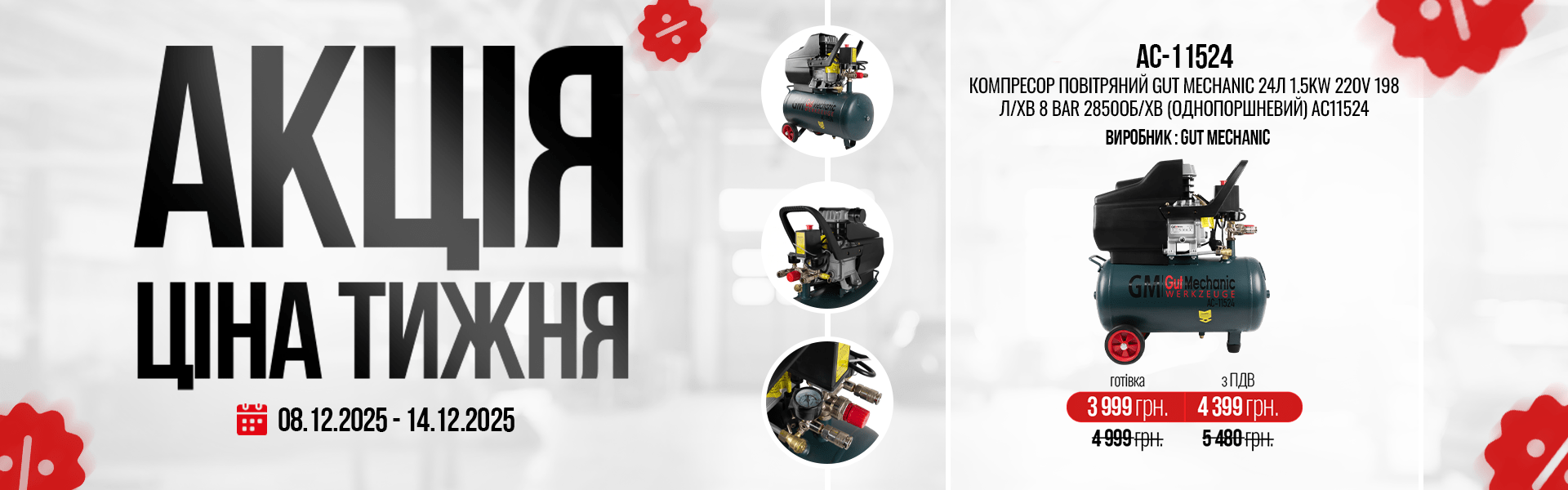 З 08.12.2025 до 14.12.2025 встигни придбати повітряний компресор Gut Mechanic 24L AC-11524 за суперціною.